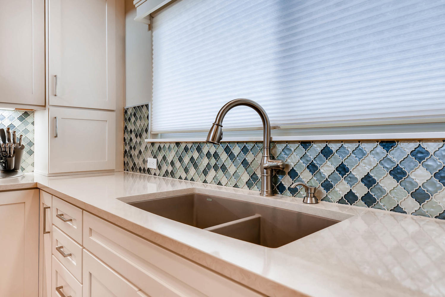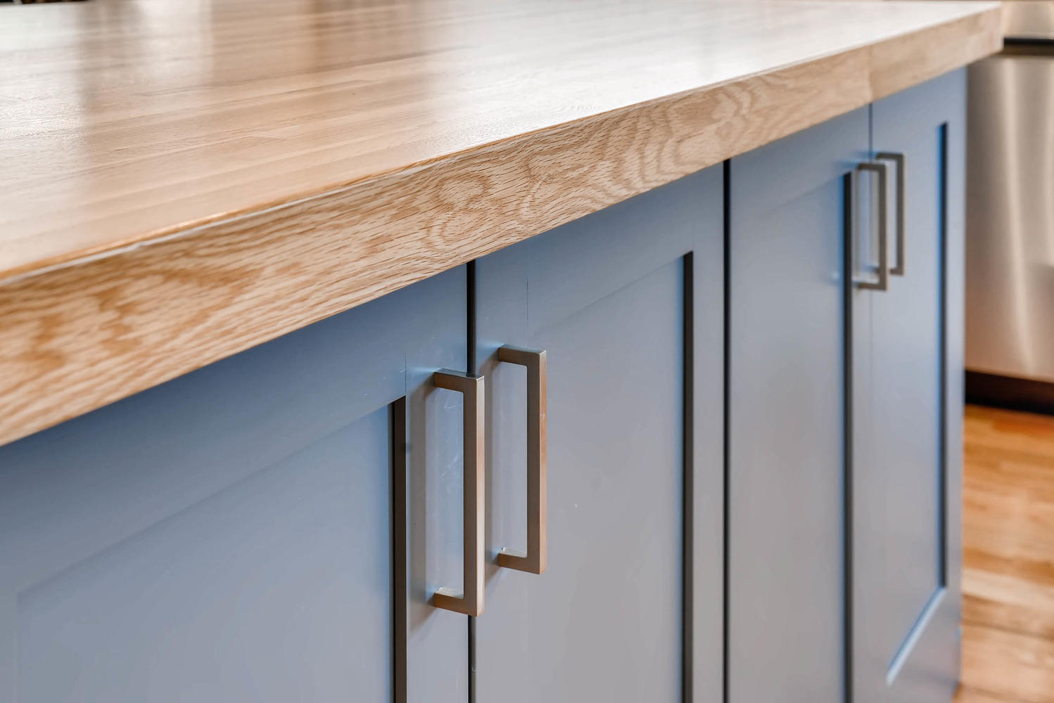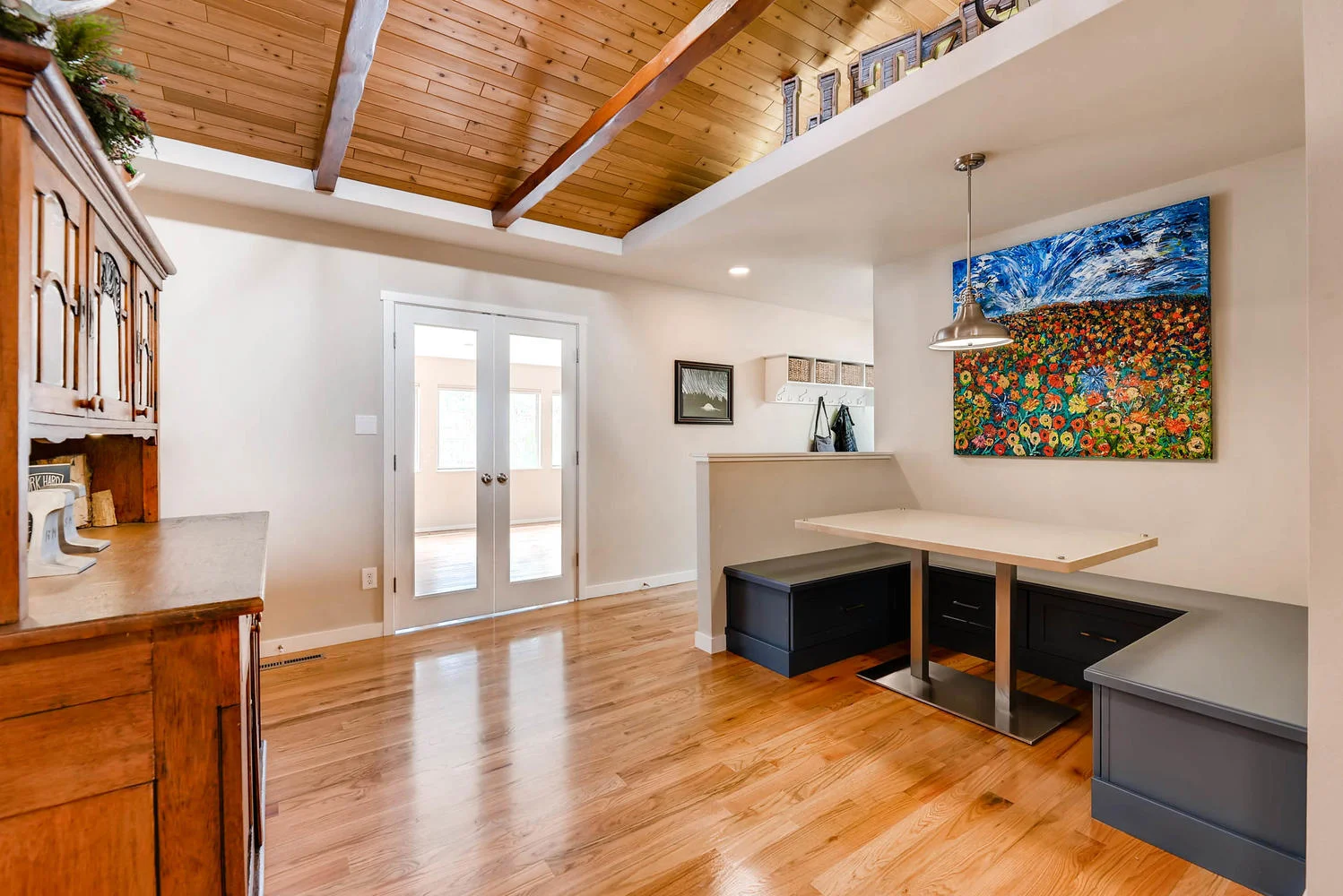 In an effort to highlight the large window above the kitchen sink and amazing beams on the ceiling (which open up to a play area loft above), we reconfigured it all. This small family of four loves to entertain and dine with other families, but were lacking dining spaces for hosting such events. We created a dine-in kitchen nook for everyday eating and for child seating complete with benches. A large island makes serving food and chatting with dinner guests convenient and comfortable, as well as open to the adult dining space.