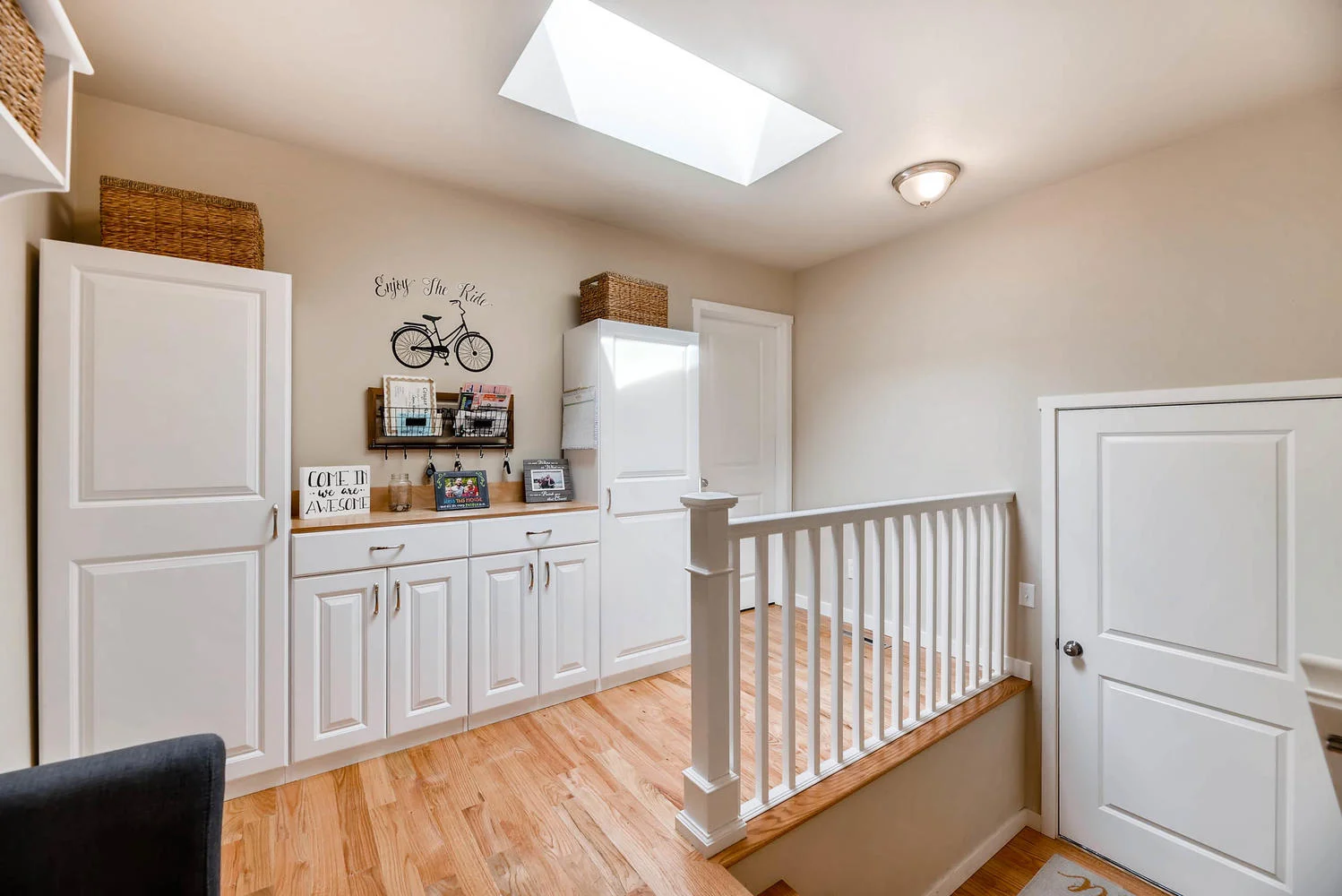 Originally there was a large room to the left of the kitchen that extended back far past the kitchen wall. Because of it’s location and size, it was not a useful room at all and ended up collecting random furniture and odds and ends. The garage entrance was in the center of the kitchen space, so we shifted this entry around to the back, giving the family a true mud room, complete with entryway lockers and a convenient drop zone for purses, keys, etc.