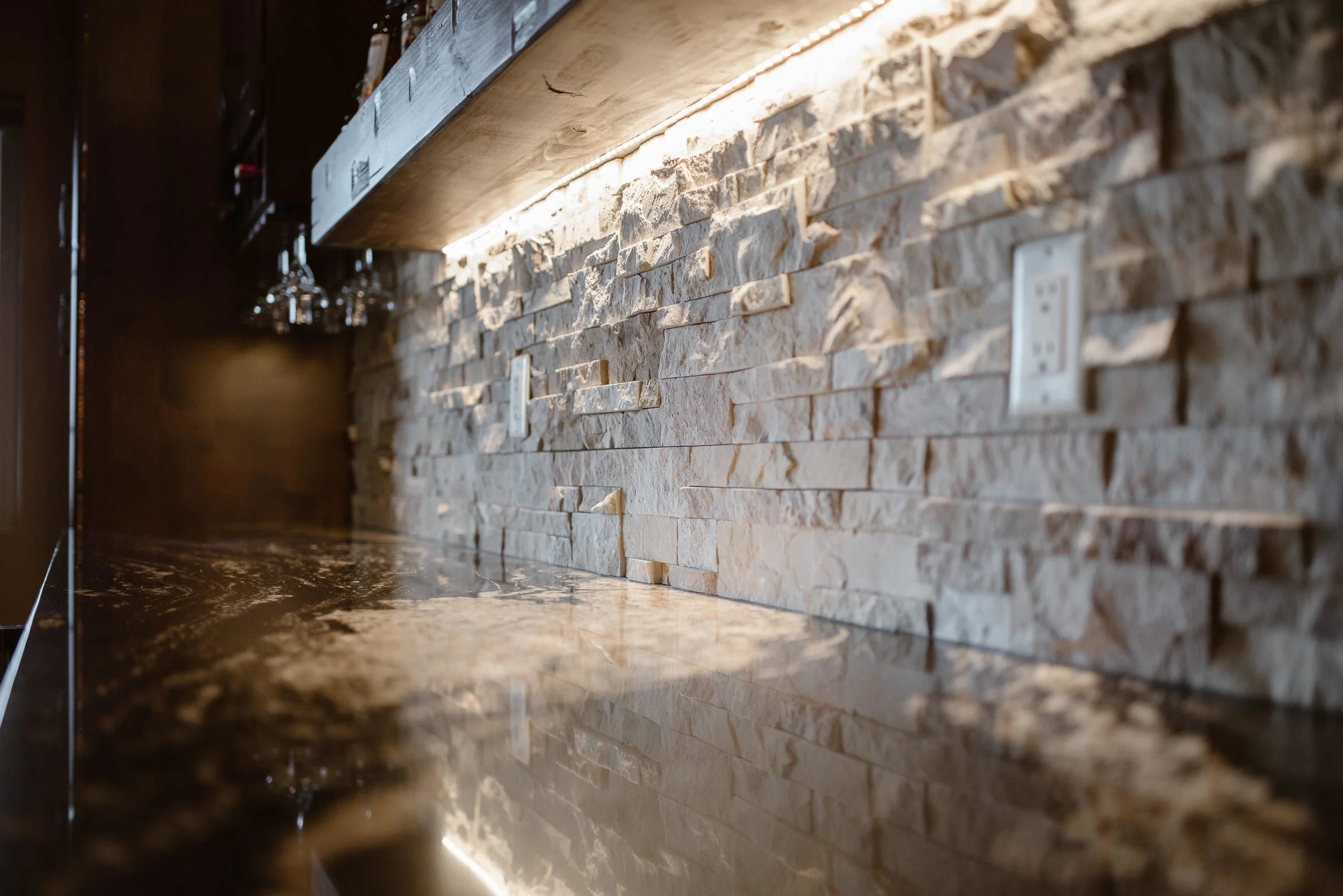 SPECIAL FEATURES: Wooden ceiling treatment, stone accents, foot rest, live edge countertop